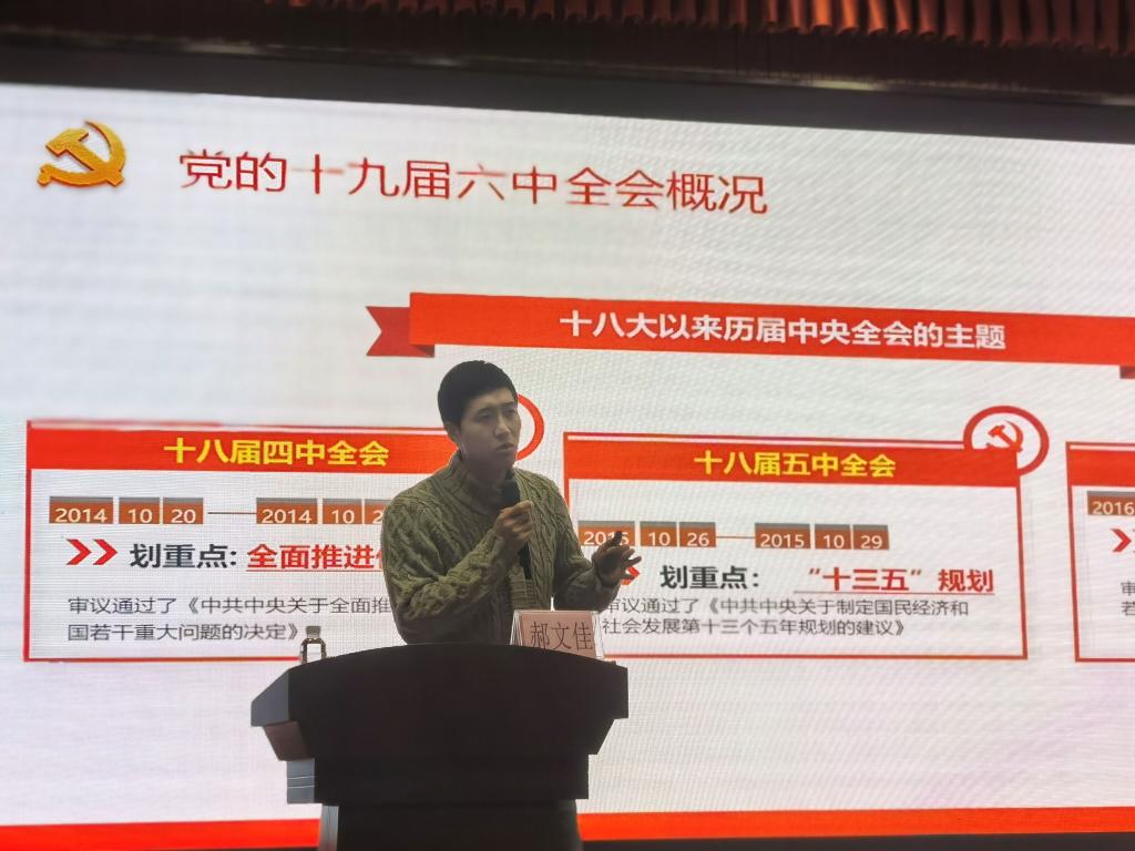 2021年11月28日上午,我院在图书馆报告厅举行了本次培训班的第二、第三讲。培训班的第二讲由王媛老师主讲,她向我们介绍了智慧团建的相关操作方法,有效提高了各团支部管理员对基层团务工作的熟悉度。在短暂休息后,郝文佳书记向我们简要介绍了党的十九届六中全会精神,旨在让同学们深入学习贯彻党的十九届六中全会精神。郝书记提到十九届六中全会充分肯定党的十九届五中全会以来中央政治局的工作,全会提出了“四个历史时期,四个伟大飞跃”并从十三个方面总结了新时代历史性成就和历史性变革。