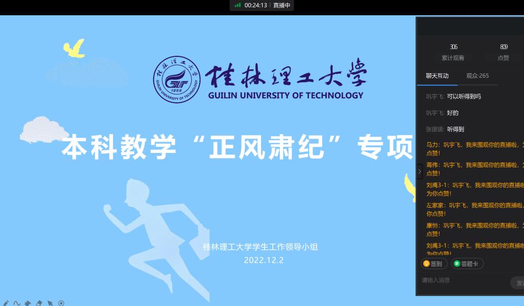 12月4日晚,各年级辅导员充分利用大学生成长成才课以专业为单位,重温了《永利yl23411集团学生学习管理规定》(桂理工教〔2009〕27号)、《永利yl23411集团全日制本科考试管理规定(修订)》(桂理工教〔2019〕20号)等规章制度。强调了违反上课纪律和考试纪律的严重后果,并告诫学生上课不得随意迟到、旷课、早退,课堂上不做与本节课堂无关的事情;严格遵守考试纪律,带好相关证件,按指定位置就坐,不得私自调换名条;开考前按要求将手机(关机)、复习资料等物品收入书包,并放在考场指定位置等事项。