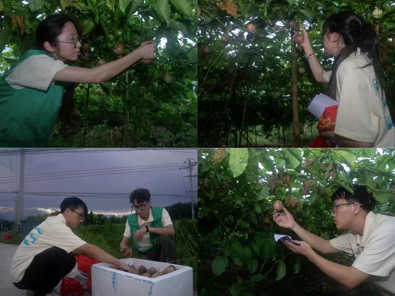 随后,成员们戴上手套,拿起剪刀,亲自参与到百香果的采摘工作中。天气炎热,百香果藤曼低矮,成员们均弯腰小心行走,虽腰酸背痛,但大家的学习和行动热情依旧高涨。他们穿梭在郁郁葱葱的百香果藤蔓之间,从识别成熟果实到小心翼翼地剪下,每一步都充满了探索与发现的乐趣。采摘之余,成员们还品尝了新鲜的百香果,那酸甜可口的滋味让他们赞不绝口,更激发了他们对农业产业的浓厚兴趣。经过一系列劳动,一颗颗百香果装满泡沫箱。
