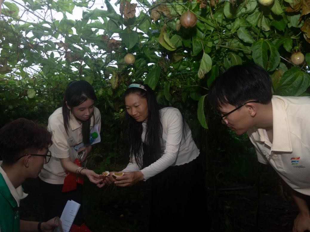 下一站,来到百香果种植基地。这里,空气中弥漫着浓郁的果香,一串串黄色的百香果挂满藤蔓,散发着诱人的香气。基地负责人向团队成员详细介绍了辨识百香果成熟与否以及正确采摘成熟果实的方法。