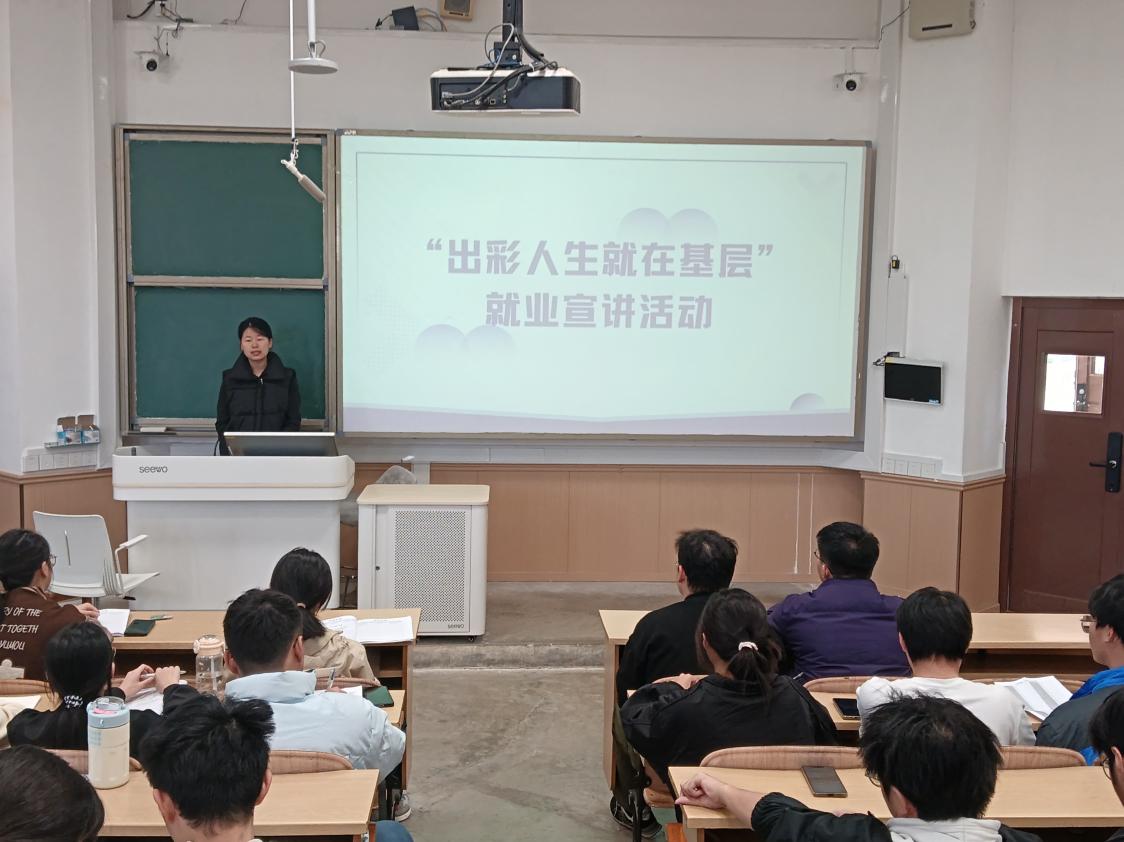 为引导青年学子树立科学就业观,破除基层就业认知误区,助力环境类专业学子明晰职业发展方向,11月24日,我院在04324教室举办“出彩人生就在基层”就业主题宣讲活动。学院各年级学生代表共80余人参会。