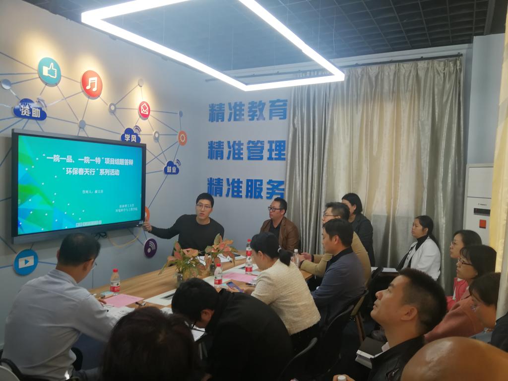 学院党委副书记郝文佳老师对我院"一院一品、一院一特"项目——“环保春天行”的典型建设、宣传推广、资金使用及绩效完成情况、成果创建等方面进行汇报,并重点介绍了学院项目建设规划与特色发展情况、学院新媒体平台运营以及项目宣传情况、资金使用情况与项目成果展示等。