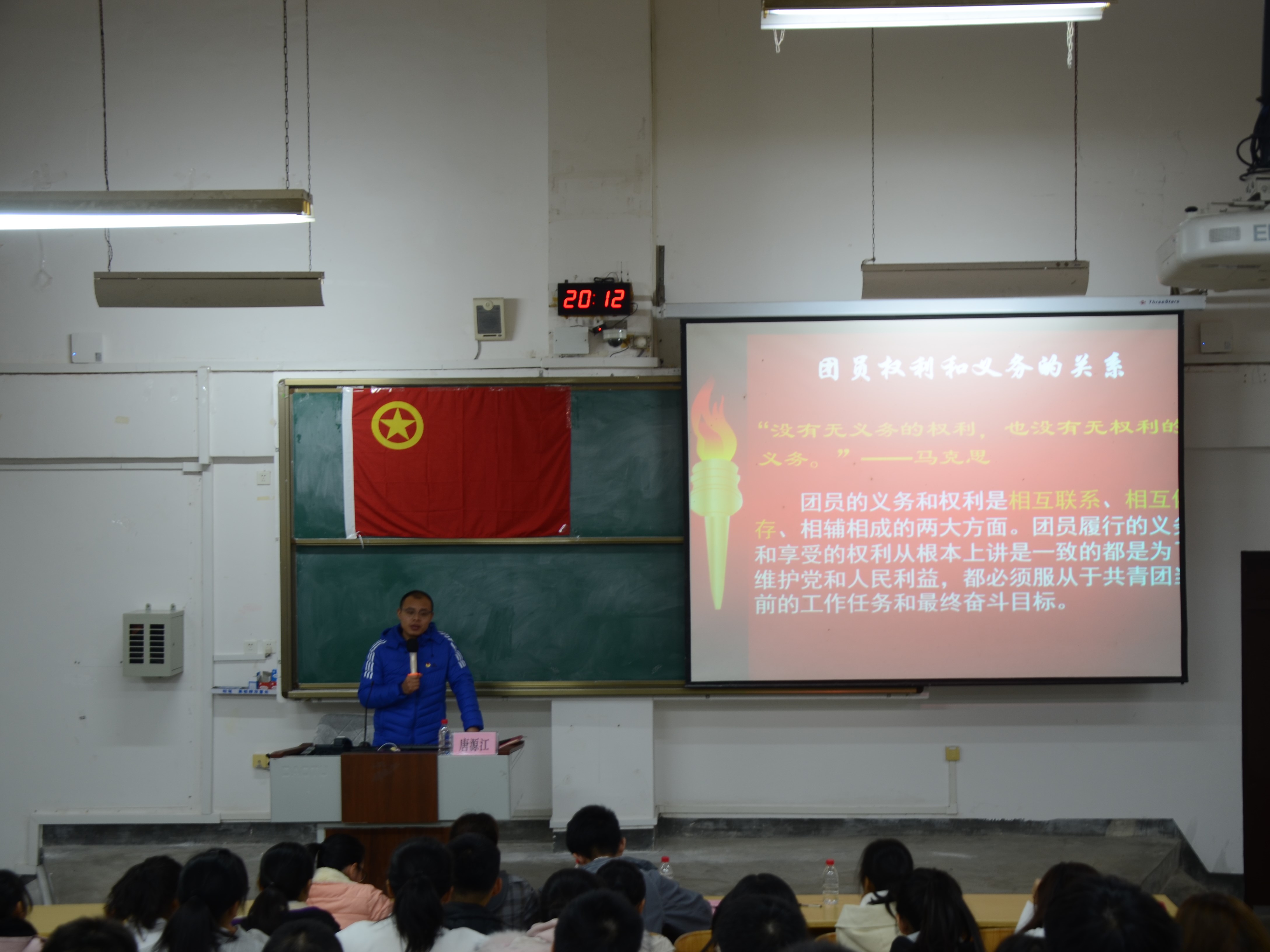 团校第一课唐源江老师向同学们讲述了他对“团员”一词的理解,认为作为一位共青团员,应该严于律己,起带头作用,为我院学子做榜样。唐老师通过讲述共青团的性质,发展历以及作为共青团员的责任及权利,表明作为一名共青团员,应不断学习中国特色社会主义的理论知识,并且无论何时都应有为人民服务,为人民奉献的精神。最后,唐老师鼓励同学们努力学习,并衷心祝愿同学们今后不论身在何方,都能在自己的岗位上发光发热,实现自己的人生价值。