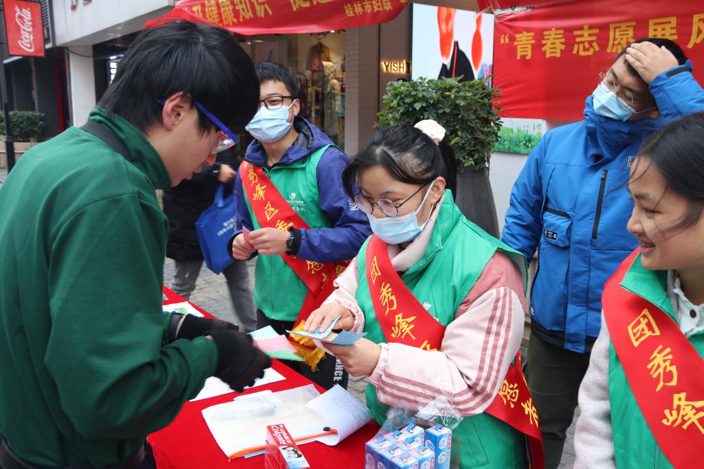 为深入贯彻落实党的十九届五中全会精神,加快推动绿色低碳发展,让“绿水青山就是金山银山”这一生态文明理念深入人心,全面提高在校大学生、市民生态环保意识。2020年12月4日,在第34个“世界国际志愿人员日”来临之际,我院携手秀峰区团委于桂林市秀峰社区卫生服务中心开展“青春志愿展风采,生态文明进万家”12.5志愿服务活动。