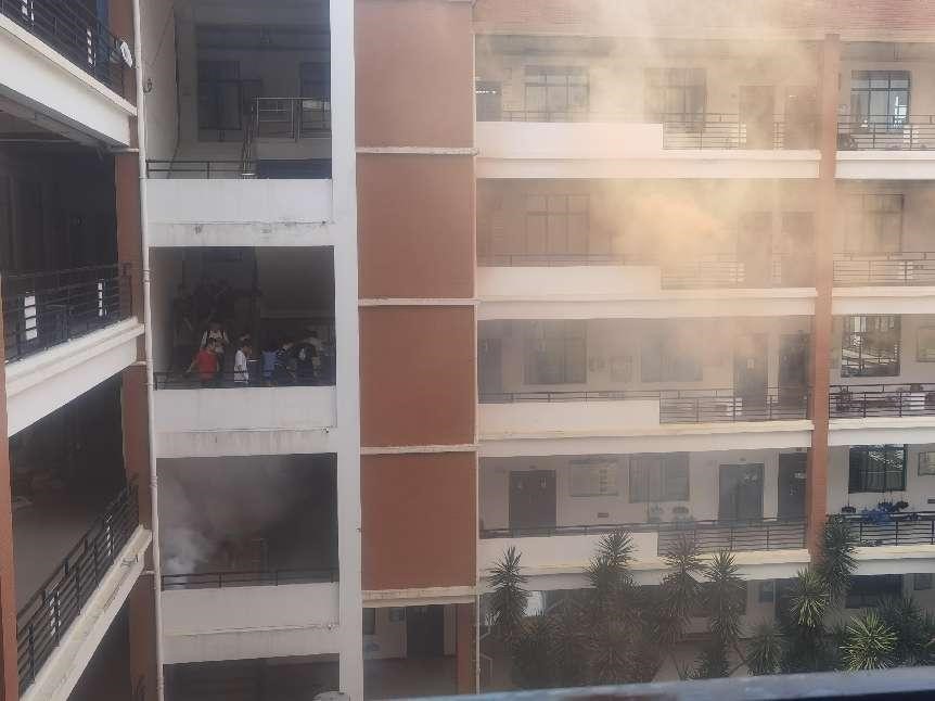 培训结束后回到各自办公室,随着火灾警报声的响起,各楼层负责人在消防疏散通道附近引导职工有序疏散。师生们沉着冷静,听从指挥,俯身快速按预定线路撤离到教12楼前空地。