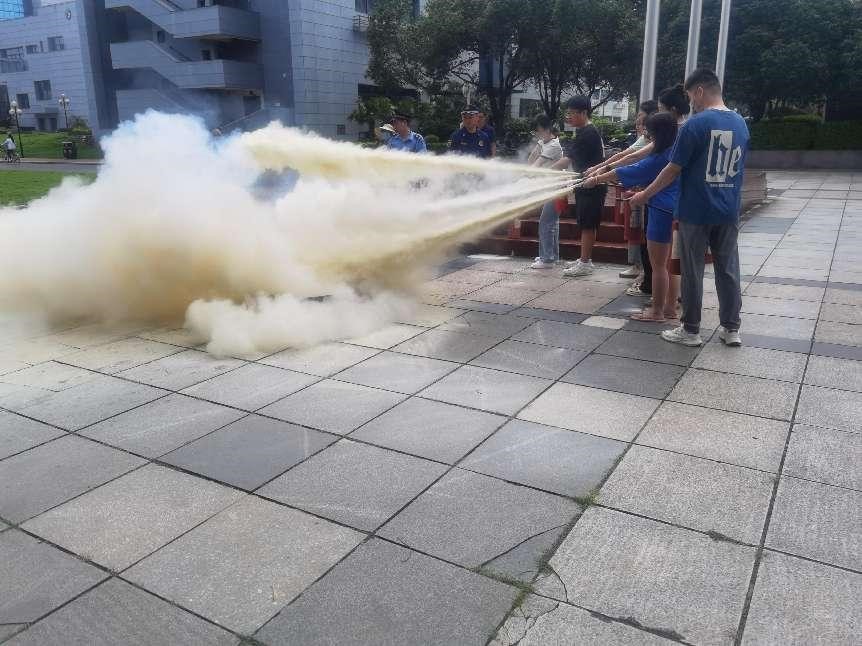 在清点人数后,保卫处副处长黎超业带领大家来的学校安全教育基地门前,点燃铁桶内易燃物,演示灭火器的使用方法,模拟对初期火灾的补救。随后手把手指导每名学生对灭火器进行操作,指出容易忽略的细节以及不同灭火器的使用方法。