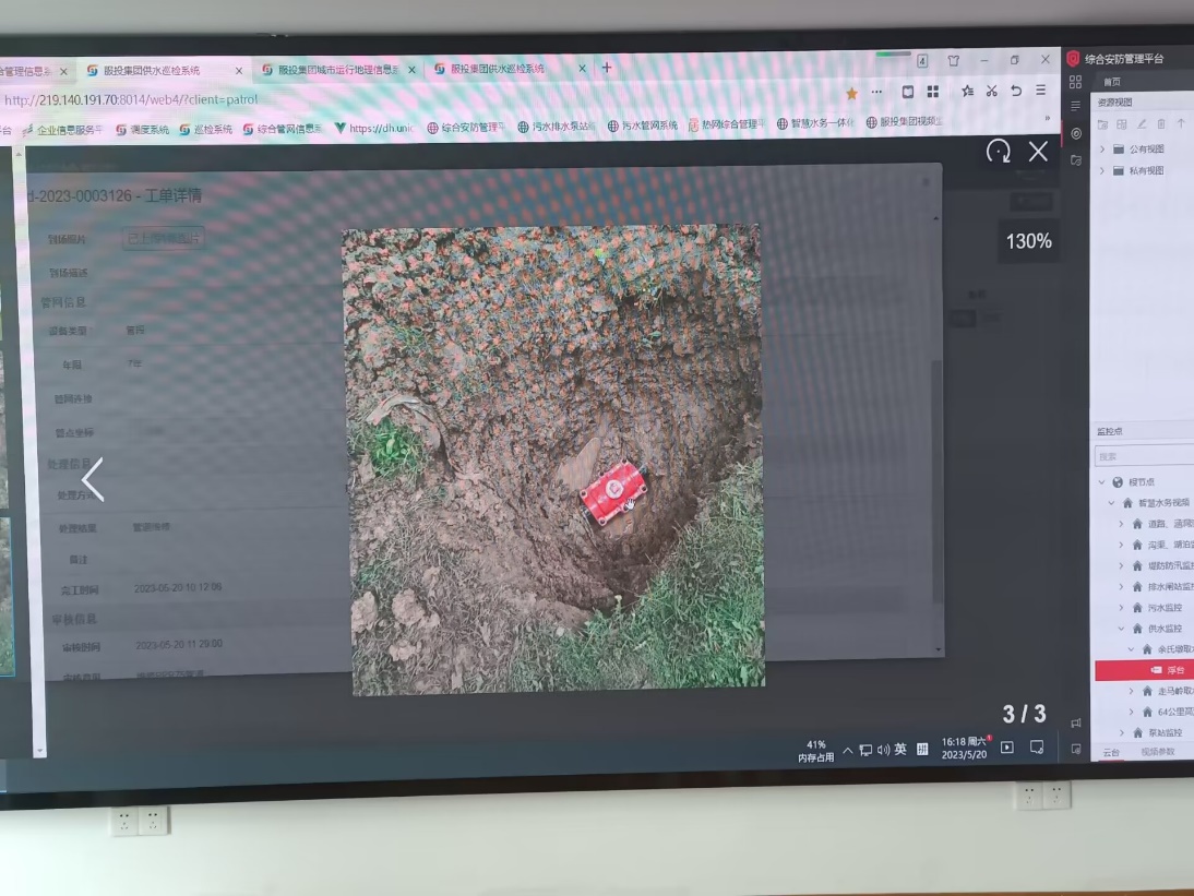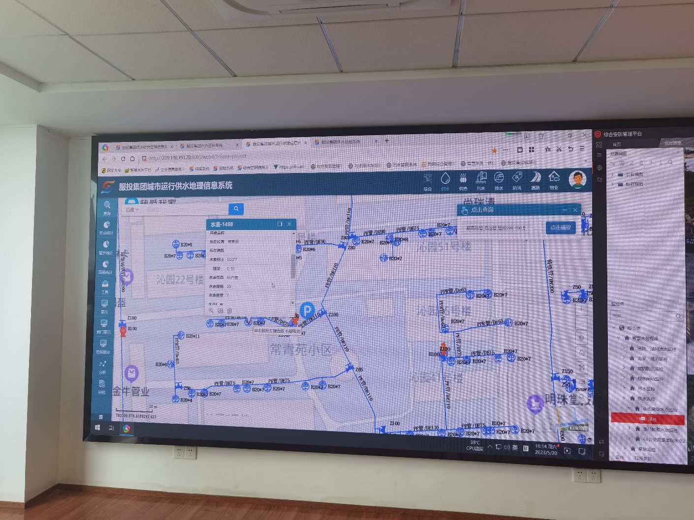 给水厂参观结束后,王总工带我们来到了中控智慧控制室,刚刚进入房间,我们便被眼前的景象深深震撼到了,呈现在眼前的是两块大屏幕,上面实时呈现着整个东西湖区各位置的监控还有整个地区的给水排水管网系统,这就是城市运行供水地理信息系统,大到城区的总体管网分布,小到入户的水表甚至是一个管道上面的异径管或是阀门,系统都能够做到实时监控并及时传递数据到总控台,呈现到面前的屏幕上,若某个位置发生了故障,总控可以及时发现并及时派人前往维修。在这个系统里,体现的是智慧水务的力量,在深受震撼的同时,也深深意识到了机控系统的强大功能,以前书本上学习到的智慧水务的知识如今也有血有肉的呈现在我们的面前,我们都发出阵阵的赞叹,作为未来的水务工作者,我们为如今水务工作的蓬勃发展而激动,也深感使命光荣和责任重大。(图三、图四)