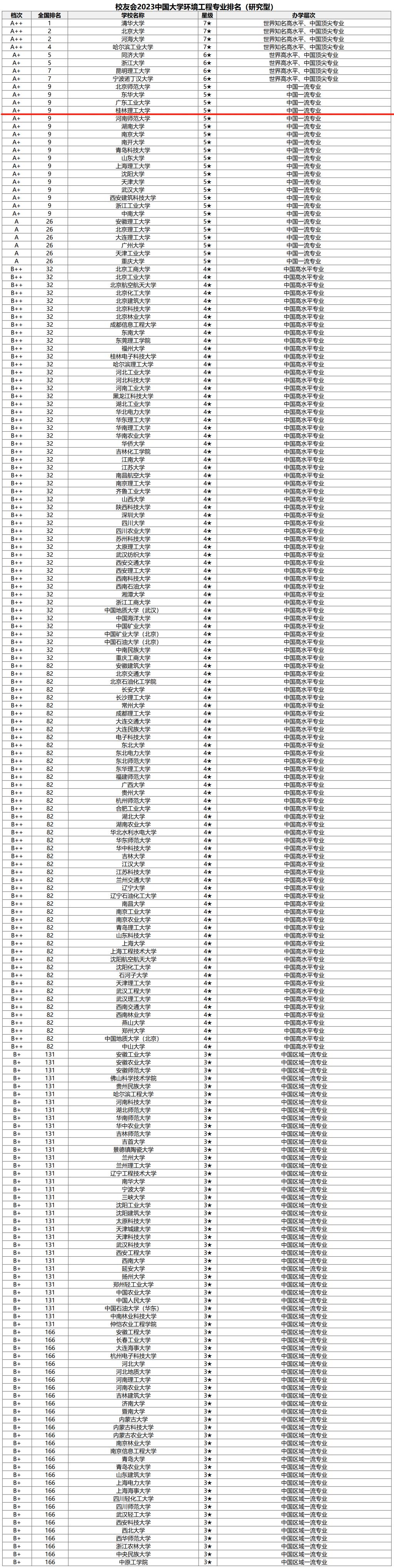 榜单显示,清华大学(7★,A++)办学实力最强,最具竞争力,办学水平最高,夺得2023校友会中国大学环境工程专业排名(研究型)冠军。河海大学(7★,A++)、北京大学(7★,A++)位列第2。哈尔滨工业大学(7★,A++)位列第4。浙江大学(6★,A+)、昆明理工大学(6★,A+)、同济大学(6★,A+)位列第5。宁波诺丁汉大学(6★,A+)位列第8。北京师范大学(5★,A+)、东华大学(5★,A+)、广东工业大学(5★,A+)、永利yl23411集团(5★,A+)、河南师范大学(5★,A+)、湖南大学(5★,A+)、南京大学(5★,A+)、南开大学(5★,A+)、青岛科技大学(5★,A+)、山东大学(5★,A+)、上海理工大学(5★,A+)、沈阳大学(5★,A+)、天津大学(5★,A+)、武汉大学(5★,A+)、西安建筑科技大学(5★,A+)、浙江工业大学(5★,A+)、中南大学(5★,A+)位列第9位。