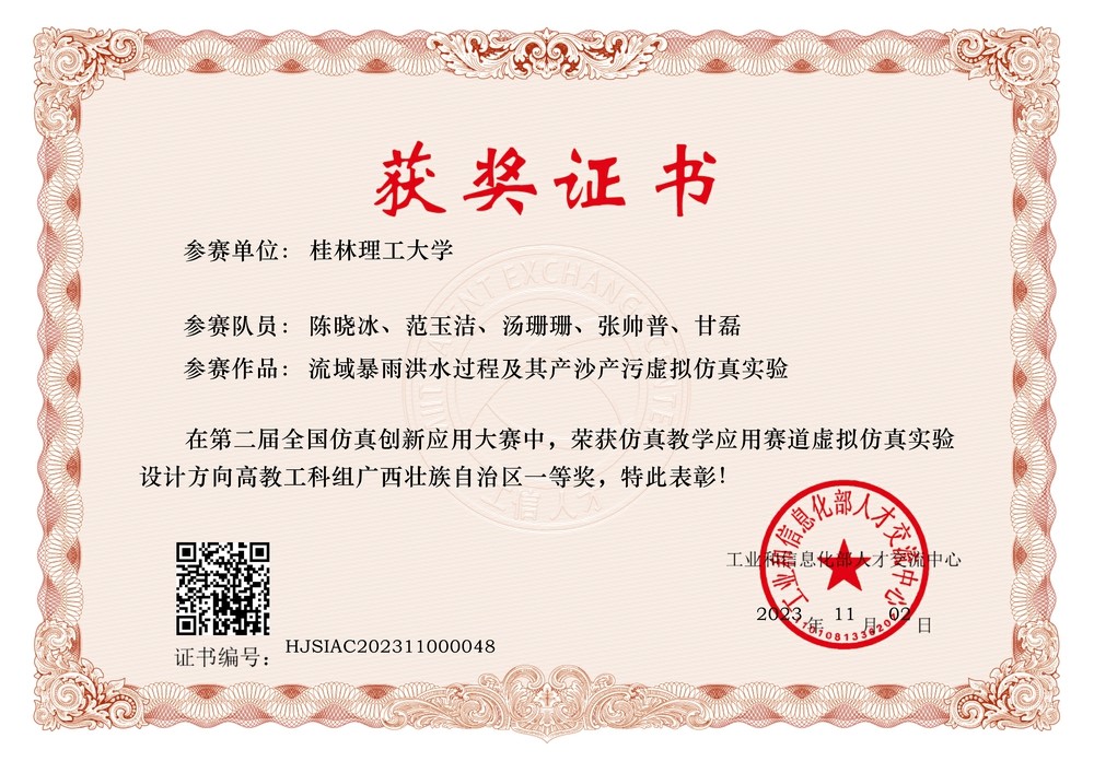 经过省级初赛,省级决赛和全国总决赛三个环节,我院陈晓冰、范玉洁、汤珊珊、张帅普和甘磊教师的团队作品《流域暴雨洪水过程及其产沙产污虚拟仿真实验》获虚拟仿真实验设计方向(高教组)全国二等奖和区级一等奖。