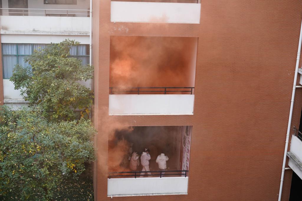 随后,在教十二楼释放消防模拟警报,各楼层师生迅速进入演练状态,在学校保卫处和各负责老师的带领下,全体人员用湿毛巾捂住口鼻,弯腰贴墙有序穿过浓烟,沿着两条既定疏散路线快速撤离到安全集合地点,整个过程紧张有序,撤离行动充分体现了两院师学生良好的应急反应能力。