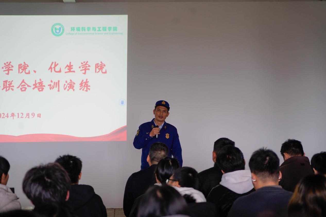 为全面贯彻落实习近平总书记关于安全工作的重要论述和学校安全稳定工作会议精神,切实提升师生消防安全意识,充分掌握逃生技能,筑牢校园安全防线,12月9日,我院联合化生学院在雁山教十二楼开展了消防知识培训及避险演练活动。环境学院党委书记代武社、化生学院党委书记彭代江、环境学院副院长朱宗强以及学校保卫处、两学院师生代表合计260余人参加了此次培训。