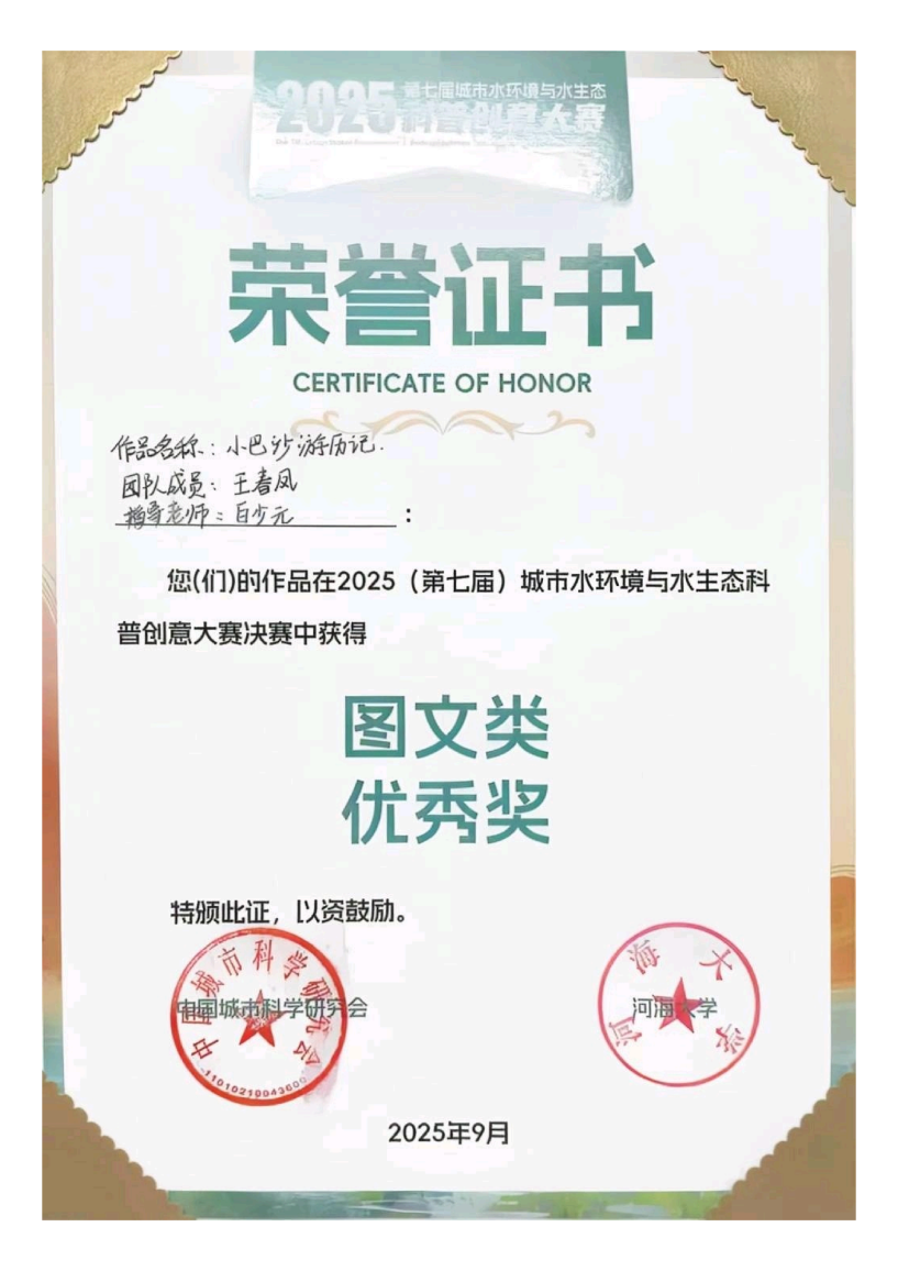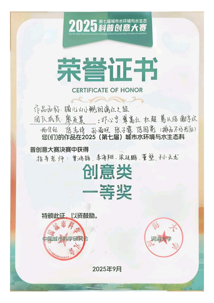 9月20日,由中国城市科学研究会、河海大学联合主办的第七届城市水环境与水生态科普创意大赛在南京圆满落幕。经过激烈角逐,我院2支科普团队脱颖而出,分别斩获创意类一等奖与图文类优秀奖。
