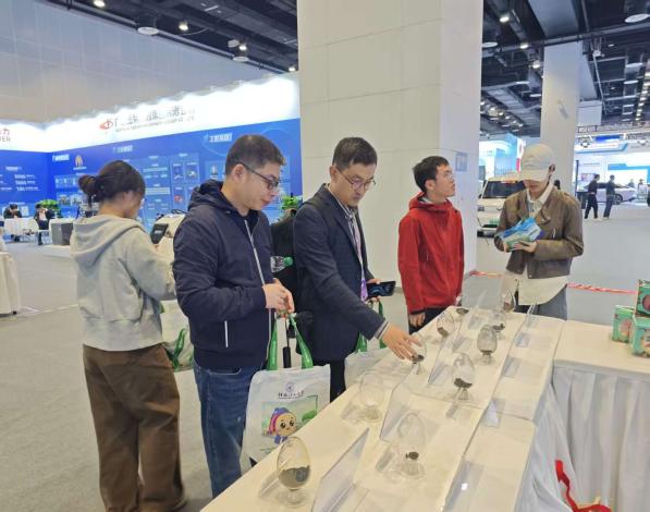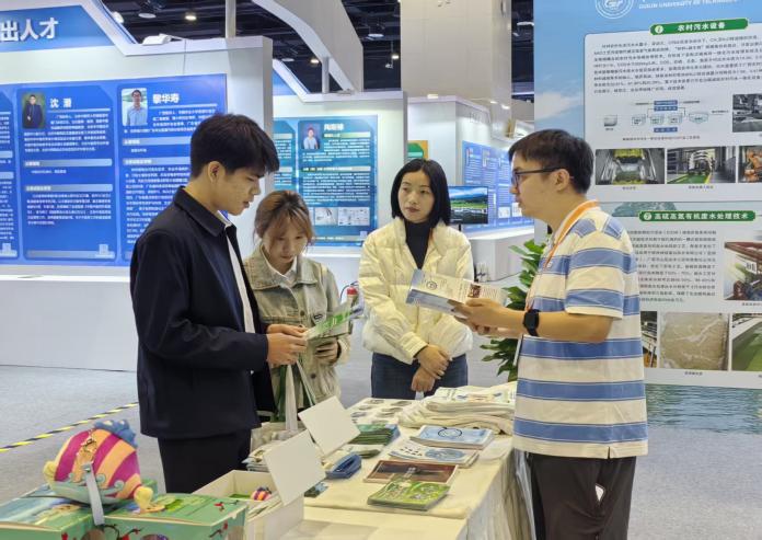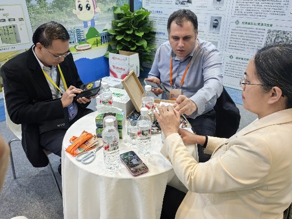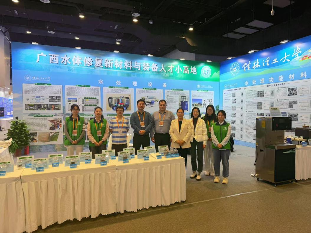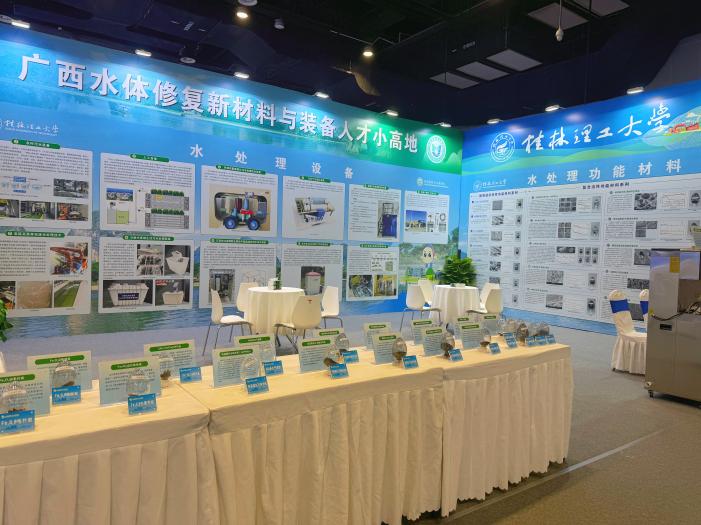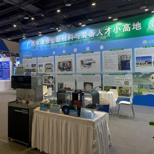展会现场,广西人才小高地展位以“山水相融”的设计理念吸引众多观众驻足。展区以“水处理功能材料”与“水处理设备”为核心,通过实物模型演示、展板静态展示等形式,系统呈现了yL23411永利集团在水污染治理、资源循环利用等领域的创新成果。其中,“水处理功能材料”系列展板呈现植物遗态改性、复合活性、功能膜三大类创新材料,每款材料都通过电镜图、性能曲线和实物展示呈现完整研发链条。“水处理设备”系列展板则聚焦技术落地,展示涵盖城乡污水、工业废水、海水淡化等全场景的11类定制化装备,其中“外源厌氧氨氧化污水处理技术装置”因“零碳源添加、降本增效”成为咨询热点。
