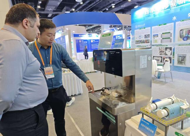 展会现场,永利yl23411集团yL23411永利集团老师及志愿者们与中外嘉宾交流洽谈、讲解水处理功能材料与装备创新成果,互动热烈