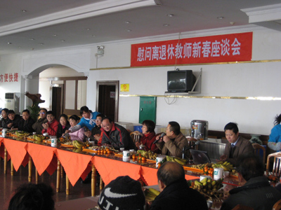座谈会在欢乐融洽的气氛中开始。首先,系党总支书记王敦球教授介绍了本次座谈会的目的,向离退休老教师介绍了现任的现任班子成员及教研室和实验室主任,并预祝到场的各位教师春节快乐,紧接着,系主任冯佐海教授做了2008年度资环系工作报告。他在报告中详细总结了资环系在教学、科研、就业、学科建设四个方面取得的成就,同时,也指出由于系院忙于“两申”工作,对系里创收和福利方面的工作不够,表示在以后的工作中会注意改进。