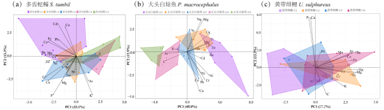 yL23411永利集团水域生态学组于2022年4月在北部湾中南部进行布点并采集32尾多齿蛇鲻、34尾大头白姑鱼及33尾黄带绯鲤,测定P、K、Ca、Na、Mg、Fe、Zn、Mn、Ti、Cr、Co、Ni、Cu、As、Ba、Cd、Pb和Sb元素含量和碳、氮稳定同位素(δ13C和δ15N)含量,分析多维化学计量生态位和碳氮稳定同位素营养生态位,比较这3种优势鱼类元素组成及其多维化学计量生态位和碳氮稳定同位素营养生态位的差异。结果表明,北部湾中南部海域3种优势鱼类元素含量和碳氮稳定同位素含量存在明显的种间及种内差异,其超体积生态位排序为大头白姑鱼(280.97)>多齿蛇鲻(174.45)>黄带绯鲤(98.30),生态位面积排序为多齿蛇鲻(6.63)>黄带绯鲤(4.00)>大头白姑鱼(2.46)。3种优势鱼类种间和种内均存在一定程度生态位重叠,如种间生态位重叠概率最高的是多齿蛇鲻与大头白姑鱼 (14.04%),而种间生态位重叠概率最低的是多齿蛇鲻与黄带绯鲤 (1.76%);种内生态位重叠最高的是黄带绯鲤,多齿蛇鲻次之,大头白姑鱼最小。此外,3种优势鱼类多维化学计量超体积生态位与种内差异有关,种内差异越大其超体积生态位越大。