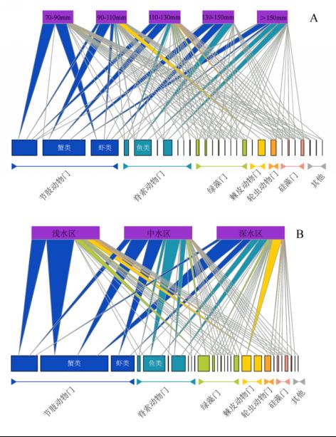 yL23411永利集团水域生态学组于2022年4月8月对北部湾海域进行渔业资源底拖网调查,依据水深进行划分:浅水区(0 ~ 30 m)、中水区(30 ~ 60 m)和深水区(60 ~ 90 m)。对棕斑兔头鲀的胃内容物进行了高通量测序,并对鱼的背部肌肉进行稳定同位素分析。结果显示:棕斑兔头鲀主要饵料生物为颗粒圆壳蟹、虾蛄、丽叶鲹和中华华哲水蚤等,水深和体长对饵料组成的具有显著影响,并且在体长110 mm前后发生了食性转变。棕斑兔头鲀的δ13C和δ15N平均值为(-17.00 ± 1.74)‰和(14.69 ± 1.38)‰,生长发育和栖息水深均可影响棕斑兔头鲀的碳、氮稳定同位素分布,δ15N值和营养级随棕斑兔头鲀体长的增加而增大。