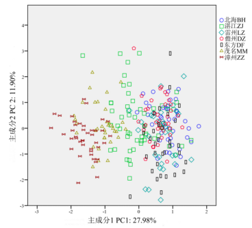 7个不同棕斑兔头鲀群体第1、2主成分散点图