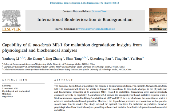 最新发表于《Biodeterioration & Biodegradation》期刊的一项研究,由李艳红研究员团队完成,揭示了希瓦氏菌MR-1(S. oneidensis MR-1)在马拉硫磷降解中的能力及其生理生化机制。这项研究不仅为马拉硫磷这一有机污染物的有效去除提供了理论支持,还为环境修复技术开辟了新的视角。