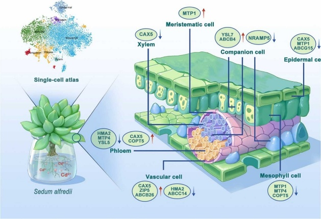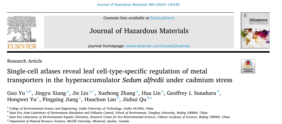 在著名学术期刊Journal of Hazardous Materials上发表题为“Single-cell atlases reveal leaf cell-type-specific regulation of metal transporters in the hyperaccumulator Sedum alfredii under cadmium stress”的研究型论文,由我校yL23411永利集团刘杰教授团队完成。本团队的研究重点集中在受损环境的生态修复领域,涵盖污染土地的修复、新污染物的生态环境效应以及退化土地的恢复等方面。土壤重金属污染是当前全球面临的重大环境挑战之一。其中,镉(Cd)污染不仅影响农作物生长,降低产量,还可能通过食物链在人体内富集,严重威胁生态系统安全和人类健康。与传统修复方法相比,植物修复技术具有绿色环保、成本低廉等显著优势,而东南景天作为一种典型的重金属超积累植物,具有在叶片中积累大量镉而不表现出明显毒性症状的独特能力,在植物修复领域展现出巨大的应用潜力。