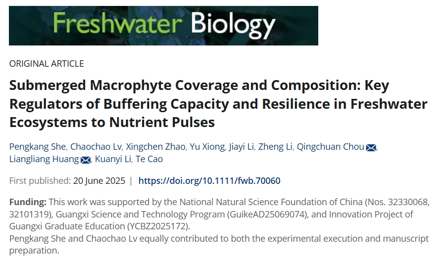 近日,在生态学知名期刊《Freshwater Biology》上发表了题为"Submerged Macrophyte Coverage and Composition:Key Regulators of Buffering Capacity and Resilience inFreshwater Ecosystems to Nutrient Pulses"的研究论文由我校yL23411永利集团水域生态学课题组黄亮亮团队完成。