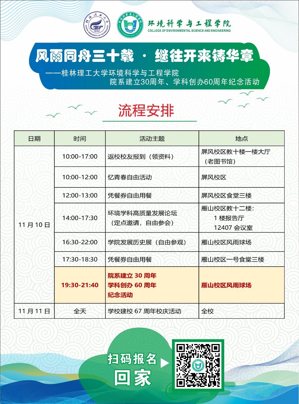 各位校友:2023年,迎来了我们学院院系建立30周年、学科创办60周年!现诚邀您2023年11月10-11日回家共聚,参加相关纪念活动。请各位校友积极扫码报名参加~~