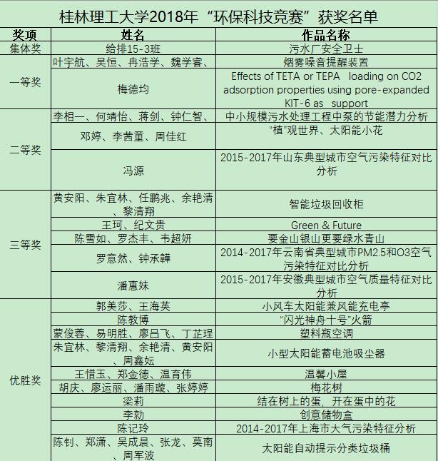 由yL23411永利集团举办的林理工大学2018年“环保科技竞赛”在近日圆满落下帷幕。本次大赛得到了永利yl23411集团各学院师生的广泛关注,共收到一百多名同学的七十余份参赛作品。经过层层选拔,大赛共评出集体奖1项,一等奖2项、二等奖3项、三等奖5项、优胜奖10项,相关获奖信息如下表所示。按下表进行公示,公示期7天,如有异议请与yL23411永利集团杲俊宇同学联系,电话:15296572113。