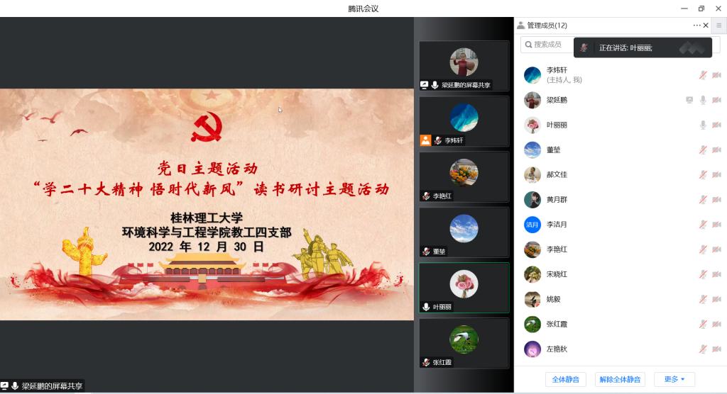 习近平总书记在党的二十大报告中指出:“中国共产党第二十次全国代表大会,是在全党全国各族人民迈上全面建设社会主义现代化国家新征程、向第二个百年奋斗目标进军的关键时刻召开的一次十分重要的大会。”为认真学习贯彻党的二十大精神,2022年12月30日,我院教工四支部于线上开展党日主题活动:“学二十大精神 悟时代新风”读书研讨主题活动。本次党日主题活动由党支部书记梁延鹏主持。