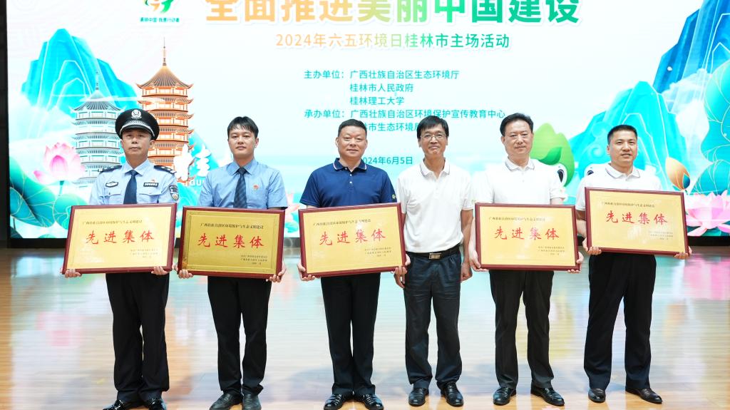 为自治区环境保护与生态文明建设先进集体、广西生态环境宣传教育实践基地、广西大学生环保科普创意大赛获奖学生授匾颁奖
