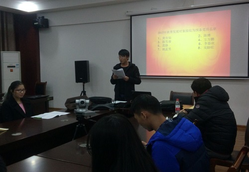 2017年12月10日晚在12407举行yL23411永利集团学生一支部大会和预备党员接收大会。会议开始,学生一支部书记黄兆凡老师首先对近期支部工作情况做出总结,指出在收集党员材料过程中,部分同学存在迟交表格、信息错误等问题。