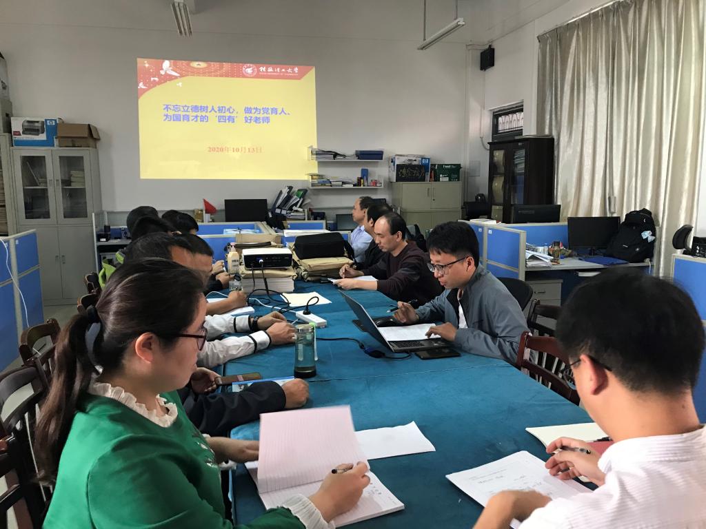 2020年10月13日下午,我院水文与水资源工程教研室在雁山12416办公室召开关于深入学习贯彻习近平总书记重要文章《思政课是落实立德树人根本任务的关键课程》的专题学习及“不忘立德树人初心,做为党育人,为国育才的‘四有’好老师”的交流会。会议由教研室主任张帅普老师主持,教研室全体教师参加了本次会议。