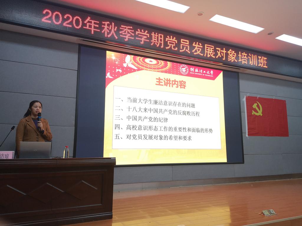 11月5日晚,由我院牵头主办的联合分党校2020年秋季学期党员发展对象培训班在雁山校区01501会议室开展了《党纪党章、意识形态及防范宗教校园渗透教育》专题党课,此次邀请外国语学院党委副书记邓洁琼为主讲人。