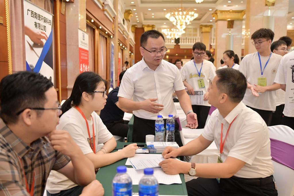 代武社、曾鸿鹄一行集中调研了广西新桂环保科技集团有限公司、上海诺天实业(集团)有限公司,并与广西合士嘉项目咨询有限公司、广西桦源环保科技有限公司、广西水视界频道信息技术有限公司、中铁城际规划建设有限公司、新宇达环保科技有限公司、博世科集团等28家环保企业进行现场交流并进行现场拓岗招聘活动,详细了解了各企业发展概况、发展历程、主营业务、人才需求等基本情况。代武社介绍了学校的办学情况和学院在永利集团、学科专业建设、学生管理等方面的发展现状以及所取得的成绩,了解企业经营状况和人才需求,并就进一步加强人才供需对接,提升永利集团质量和毕业生就业质量深入探讨。并希望双方在已有的良好合作基础上,保持良性互动,共同建立永利集团、就业联动的常态化合作机制,充分发挥双方资源和人才技术优势,深化供需对接,实现共同发展。